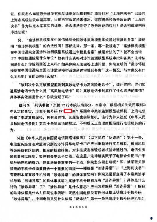 依据《中华人民共和国反电信网络诈骗法》(以下简称“反诈法”)第十一条,电信业务经营者对监测识别的涉诈异常电话卡用户应当重新进行实名核验,根据风险等级采取有区别的、相应的核验措施。对未按规定核验或者核验未通过的,电信业务经营者可以限制、暂停有关电话卡功能。在这里,法律确实赋予了电信企业把用户手机号码停机的权力,但此法条最重要的一个点,你院怎么能忽略呢?即:被采取关停措施的手机卡必须要符合一个重要的前提——那就是“涉诈异常”。“上海判决书”有查明本案案涉手机号码“涉诈异常”的具体事实吗?你院又是否查清了本案案涉手机号码“涉诈异常”的具体事实呢?案涉手机号码有没有“涉诈异常”?具体是什么行为“涉诈异常”了?“涉诈异常”是什么意思?应当怎样解释“涉诈异常”?解释的法律依据是什么?你院说来听听!既然中国电信没有任何证据证明案涉手机号码“涉诈异常”,中国电信又凭什么依据“反诈法”第十一条把案涉手机号码停机呢?