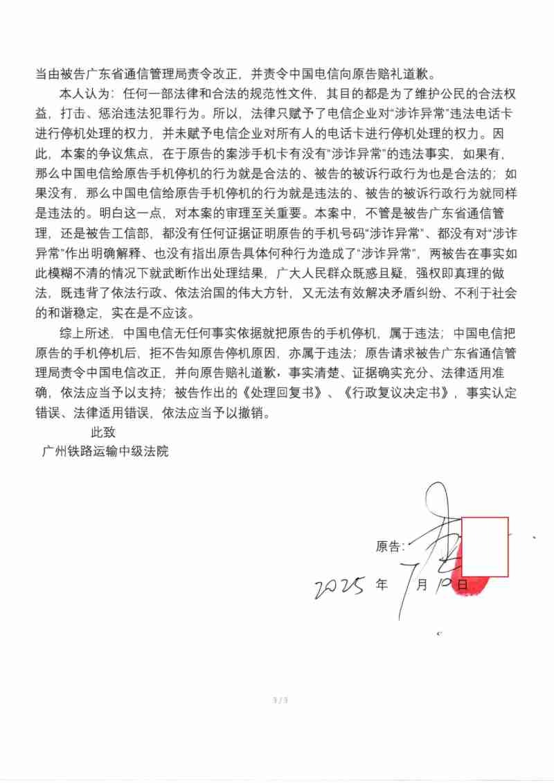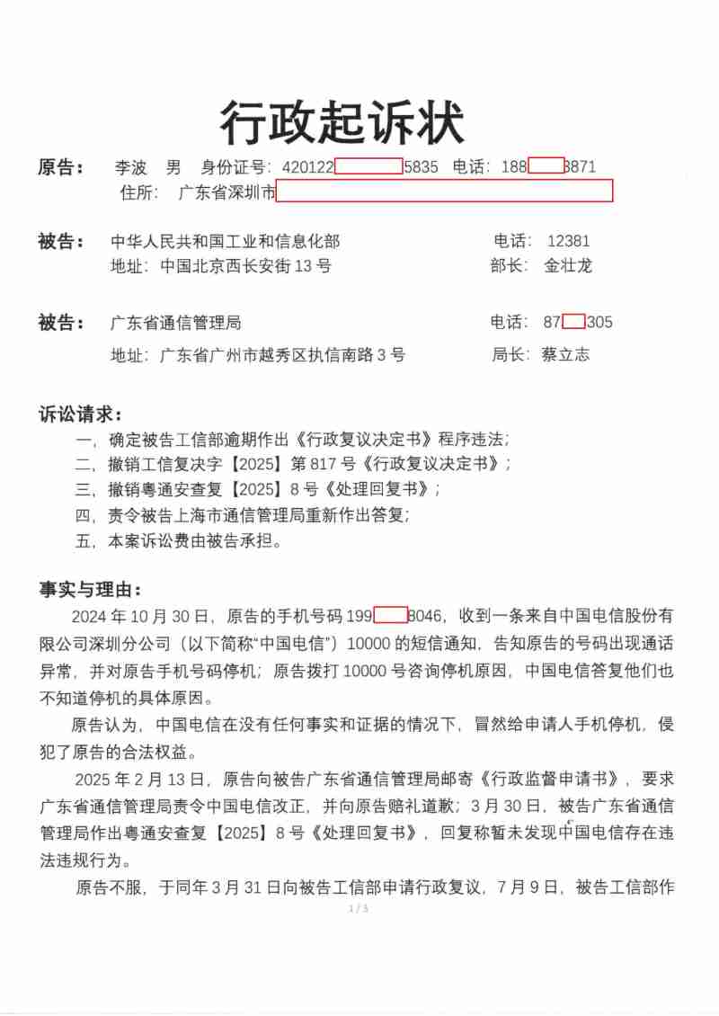 2025年2月13日,原告向被告广东省通信管理局邮寄《行政监督申请书》,要求广东省通信管理局责令中国电信改正,并向原告赔礼道歉;3月30日,被告广东省通信管理局作出粤通安查复【2025】8号《处理回复书》,回复称暂未发现中国电信存在违法违规行为。