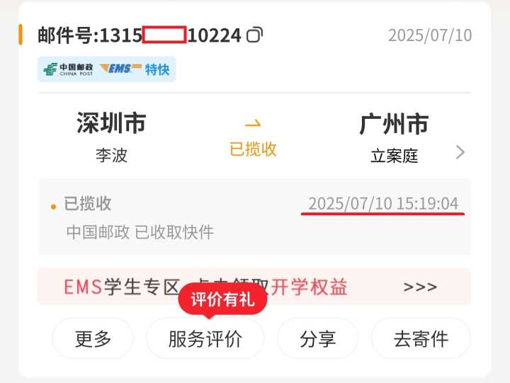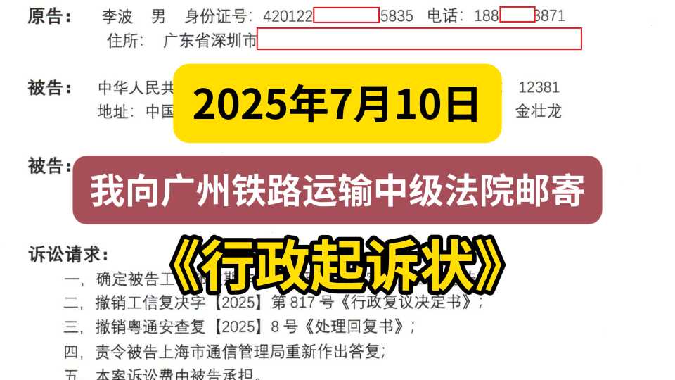 2025年7月10日,我向广州铁路运输中级法院邮寄《行政起诉状》