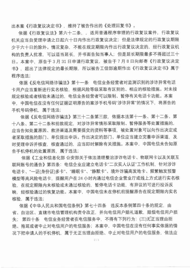 本人认为:任何一部法律和合法的规范性文件,其目的都是为了维护公民的合法权益,打击、惩治违法犯罪行为。所以,法律只赋予了电信企业对“涉诈异常”违法电话卡进行停机处理的权力,并未赋予电信企业对所有人的电话卡进行停机处理的权力。因此,本案的争议焦点,在于原告的案涉手机卡有没有“涉诈异常”的违法事实,如果有,那么中国电信给原告手机停机的行为就是合法的、被告的被诉行政行为也是合法的;如果没有,那么中国电信给原告手机停机的行为就是违法的、被告的被诉行政行为就同样是违法的。明白这一点,对本案的审理至关重要。本案中,不管是被告广东省通信管理,还是被告工信部,都没有任何证据证明原告的手机号码“涉诈异常”、都没有对“涉诈异常”作出明确解释、也没有指出原告具体何种行为造成了“涉诈异常”,两被告在事实如此模糊不清的情况下就武断作出处理结果,广大人民群众既惑且疑,强权即真理的做法,既违背了依法行政、依法治国的伟大方针,又无法有效解决矛盾纠纷、不利于社会的和谐稳定,实在是不应该。