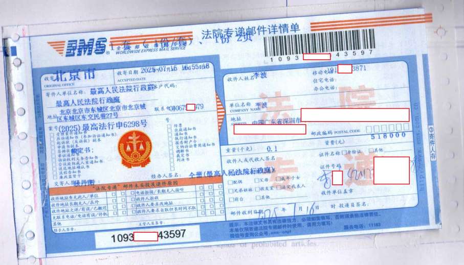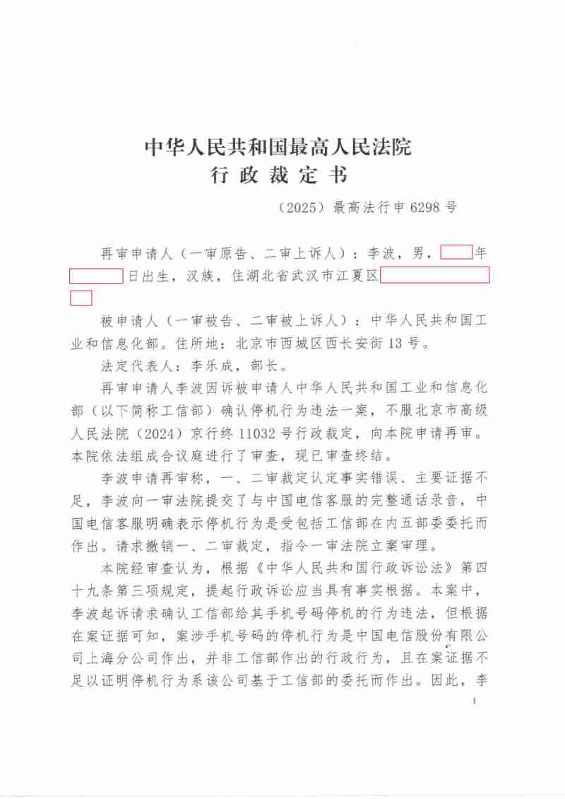 2025年7月16日,最高人民法院向我邮寄送达《行政裁定书》 栏目:工信部1 作者:duifanhuairen 时间:2025-07-16 14:41:26 2025年7月16日,最高人民法院向我邮寄送达《行政裁定书》,驳回了我在6月12日立案的再审申请。既然最高人民法院都作出再审裁定了,看来中国电信说的:是国家五部委委托他们给我手机停机的说法,确确实实是在扯虎皮做大旗。 下一步我会在6个月内,依法向检察院申请抗诉,继续走完最后一个法律程序,有始有终,不留下一丝遗憾。 感谢大家的关注和支持,有新的进展我会及时更新。相关文章:2025年6月12日,最高法再审立案(关于手机停机)2025年5月20日,我向最高法申请再审(关于手机停机)北京高级法院作出的二审《行政裁定书》(关于手机停机)我向北京高级法院递交的《行政上诉状》(关于手机停机)北京第一中级法院作出的一审《行政裁定书》(关于手机停机)我向北京第一中级法院邮寄的《行政起诉状》(关于手机停机)工信部给我的《不予受理行政复议申请决定书》(关于手机停机)我向工信部提交的《行政复议申请书》(关于手机停机) 怼翻坏人 中国电信 手机停机 热点 工信部 法院 行政诉讼 行政起诉状