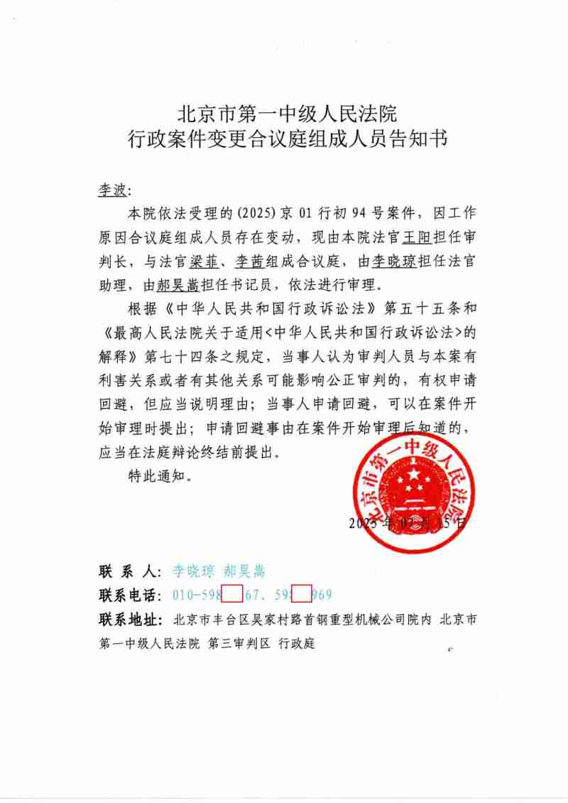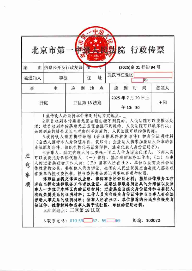 2025年7月16日,北京第一中级法院向我邮寄送达开庭《传票》 栏目:工信部4 作者:duifanhuairen 时间:2025-07-16 21:12:43 感谢大家的关注和支持,有新的进展我会及时更新。相关文章:2025年7月15日,北京一中院来电,本月29号上午10点30时分开庭,被告不同意线上开庭2025年7月4日,北京一中院来电,询问《监测识别规则》是什么工信部提交给法院的《行政答辩状》4(关于信息公开)我向法院提交的《行政起诉状》(关于信息公开)工信部给我的《行政复议决定书》(关于信息公开)我向工信部提交的《行政复议申请书》(关于信息公开)工信部给我的《政府信息公开申请答复告知书》(关于信息公开)我向工信部提交的《政府信息公开申请书》(关于信息公开) 怼翻坏人 中国电信 手机停机 热点 工信部 法院 行政诉讼 行政起诉状