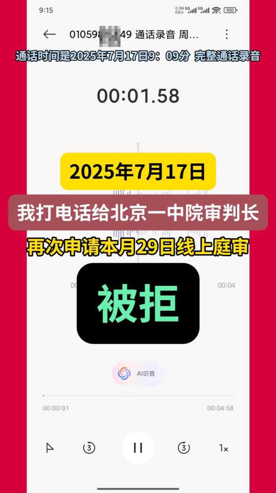 2025年7月17,我再次申请本月29日线上庭审,被拒 栏目:工信部4 作者:duifanhuairen 时间:2025-07-17 10:11:35 这次通话中,我再次向审判长申请线上庭审,并提出了7点事实与理由,但审判长最后还是拒绝了我的申请,还是要求我必须去北京参加线下庭审。 但这次通话让我知道了法院不准许我线上参加庭审的原因:不是因为被告不同意我线上参加庭审,主要是法院不同意我线上参加庭审。 因为法官没有给出让我信服的事实与理由,所以下一步我会邮寄《回避申请书》和《投诉信》。 感谢大家的关注和支持,有新的进展我会及时更新。相关文章:2025年7月16日,北京第一中级法院向我邮寄送达开庭《传票》2025年7月15日,北京一中院来电,本月29号上午10点30时分开庭,被告不同意线上开庭2025年7月4日,北京一中院来电,询问《监测识别规则》是什么工信部提交给法院的《行政答辩状》4(关于信息公开)我向法院提交的《行政起诉状》(关于信息公开)工信部给我的《行政复议决定书》(关于信息公开)我向工信部提交的《行政复议申请书》(关于信息公开)工信部给我的《政府信息公开申请答复告知书》(关于信息公开)我向工信部提交的《政府信息公开申请书》(关于信息公开) 怼翻坏人 中国电信 手机停机 热点 工信部 法院 行政诉讼 行政起诉状