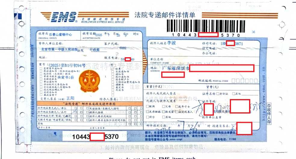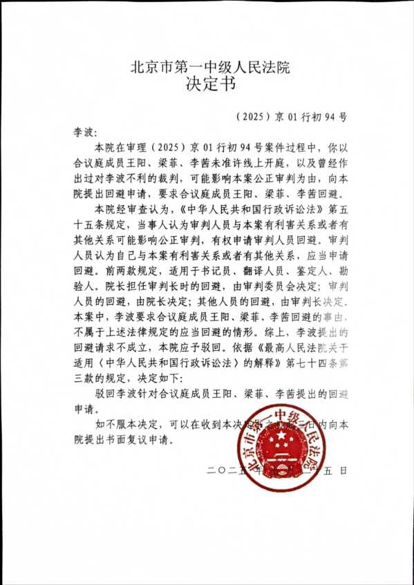 2025年7月26日,北京第一中级法院向我邮寄送达,驳回回避申请《决定书》 栏目:工信部4 作者:duifanhuairen 时间:2025-07-26 21:24:21 7月29日北京法院公开开庭,倒计时还有2天。相关文章:2025年7月25日,北京第一中级法院网发布开庭公告,7月29日公开开庭2025年7月18日,和《回避申请书》一同邮寄的,还有《投诉信》2025年7月18日,邮寄《回避申请书》,申请回避2025年7月17,我再次申请本月29日线上庭审,被拒2025年7月16日,北京第一中级法院向我邮寄送达开庭《传票》2025年7月15日,北京一中院来电,本月29号上午10点30时分开庭,被告不同意线上开庭2025年7月4日,北京一中院来电,询问《监测识别规则》是什么工信部提交给法院的《行政答辩状》4(关于信息公开)我向法院提交的《行政起诉状》(关于信息公开)工信部给我的《行政复议决定书》(关于信息公开)我向工信部提交的《行政复议申请书》(关于信息公开)工信部给我的《政府信息公开申请答复告知书》(关于信息公开)我向工信部提交的《政府信息公开申请书》(关于信息公开) 怼翻坏人 中国电信 手机停机 热点 工信部 法院 行政诉讼 行政起诉状