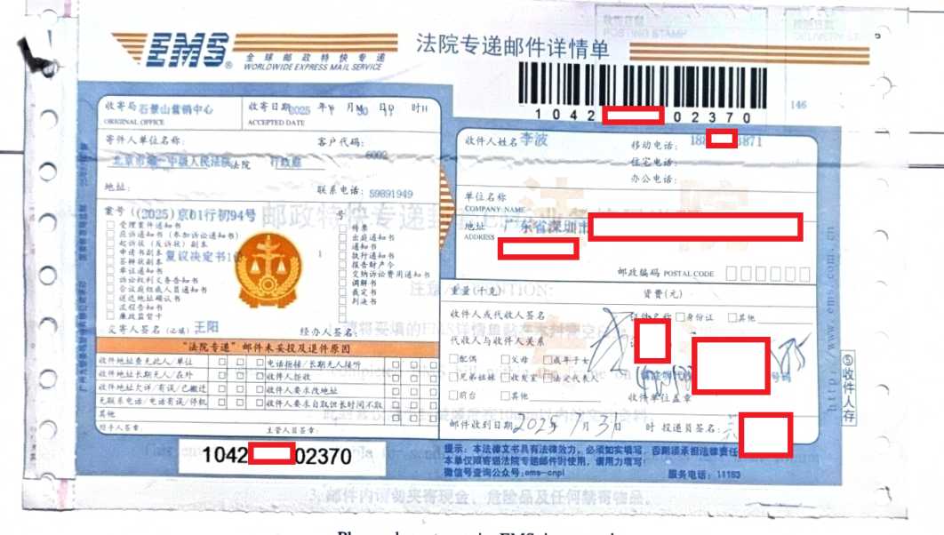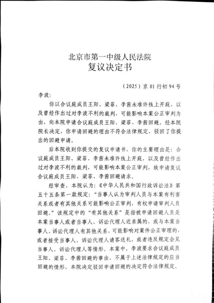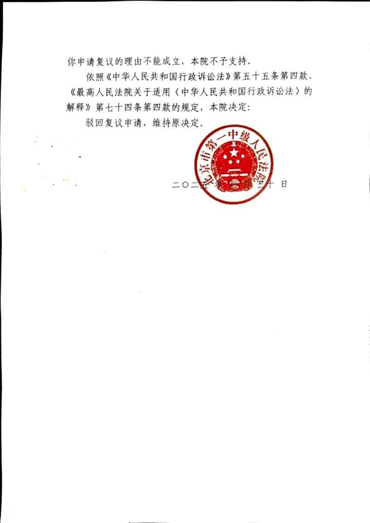 2025年7月31日,北京第一法院向我邮寄送达驳回《复议决定书》 栏目:工信部4 作者:duifanhuairen 时间:2025-07-31 21:34:17 感谢大家的关注和支持,后续我会陆续更新这几天的北京之行。相关文章:2025年7月27日,向北京第一中级法院递交的《复议申请书》准备就绪2025年7月26日,北京第一中级法院向我邮寄送达,驳回回避申请《决定书》2025年7月25日,北京第一中级法院网发布开庭公告,7月29日公开开庭2025年7月18日,和《回避申请书》一同邮寄的,还有《投诉信》2025年7月18日,邮寄《回避申请书》,申请回避2025年7月17,我再次申请本月29日线上庭审,被拒2025年7月16日,北京第一中级法院向我邮寄送达开庭《传票》2025年7月15日,北京一中院来电,本月29号上午10点30时分开庭,被告不同意线上开庭2025年7月4日,北京一中院来电,询问《监测识别规则》是什么工信部提交给法院的《行政答辩状》4(关于信息公开)我向法院提交的《行政起诉状》(关于信息公开)工信部给我的《行政复议决定书》(关于信息公开)我向工信部提交的《行政复议申请书》(关于信息公开)工信部给我的《政府信息公开申请答复告知书》(关于信息公开)我向工信部提交的《政府信息公开申请书》(关于信息公开) 怼翻坏人 中国电信 手机停机 热点 工信部 法院 行政诉讼 行政起诉状