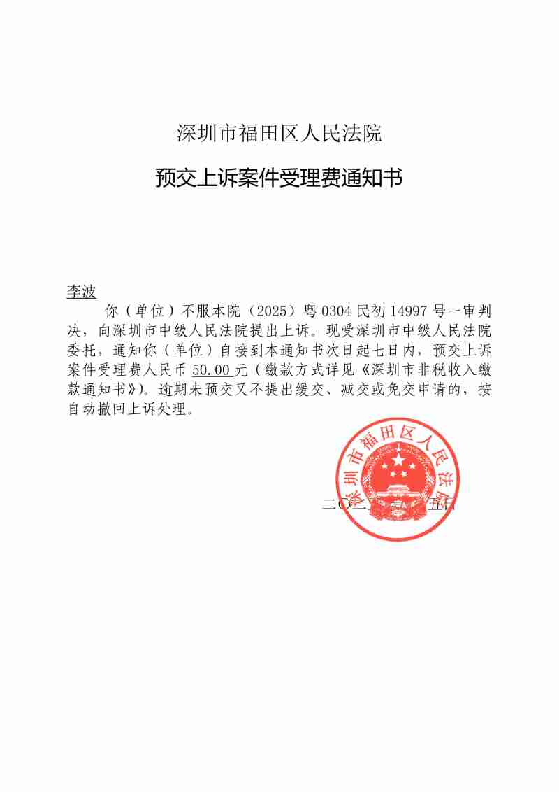 2025年8月5日,向深圳市中级人民法院缴纳二审受理费,接下来就等深圳中院的二审判决吧。