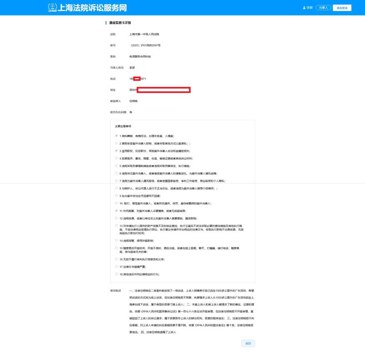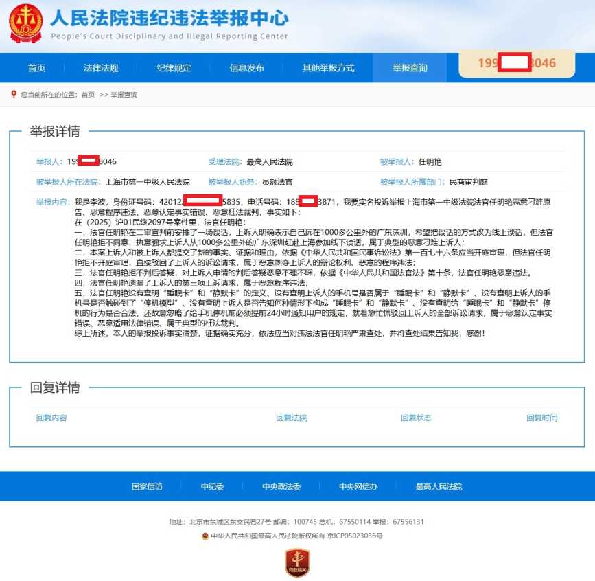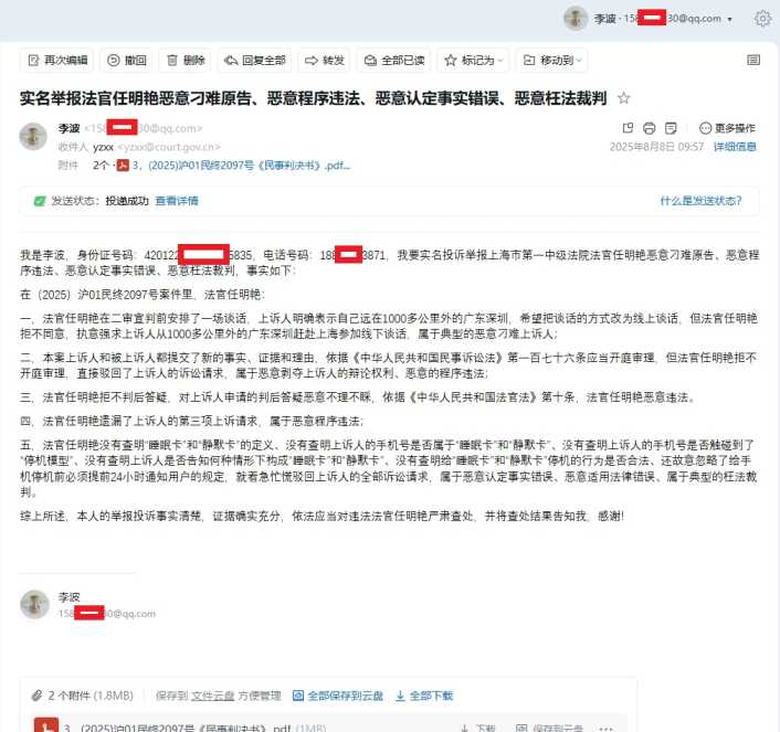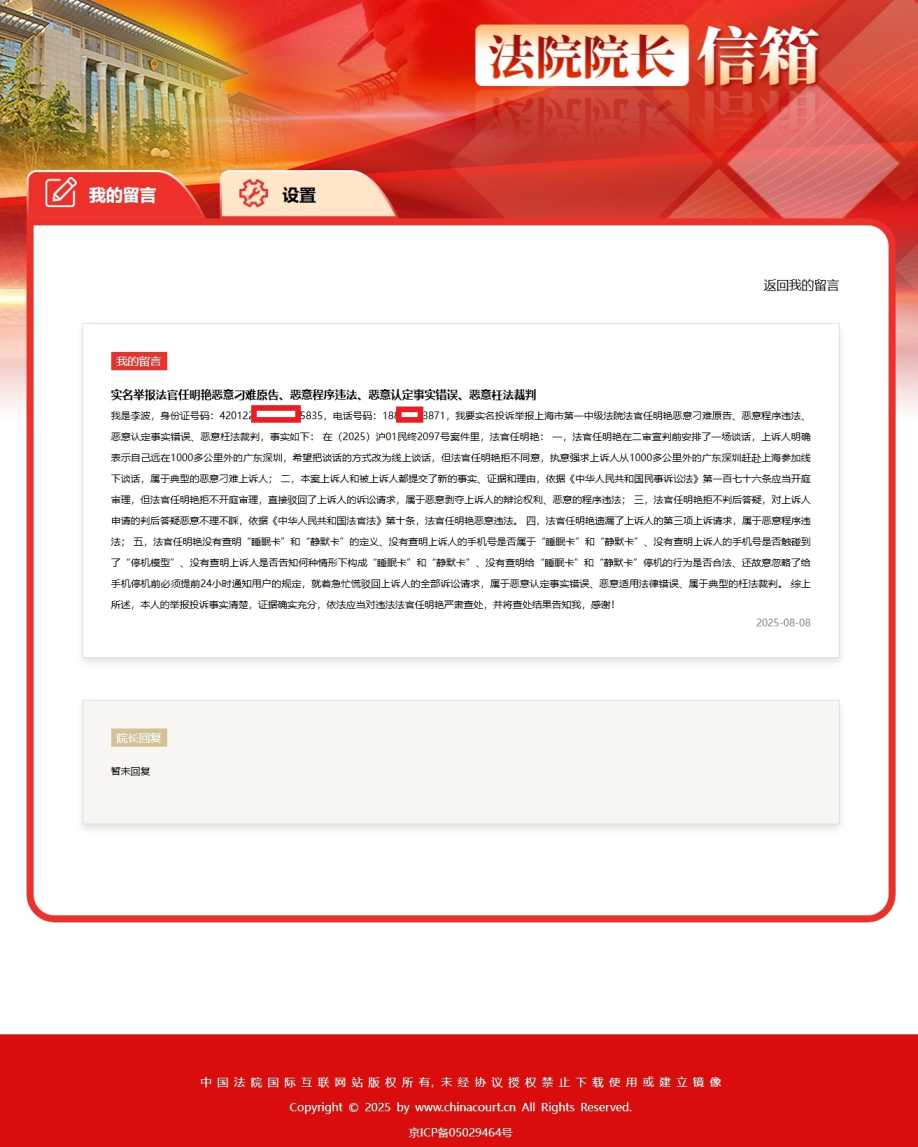 2025年8月8日,向最高法、纪委监委、上海一中院,5次实名举报 栏目:上海电信 作者:duifanhuairen 时间:2025-08-08 10:47:28 (本案案情简介: 2024年7月21日我的手机被中国电信停机;7月23日我在网上提交《民事起诉状》;8月9日,法院要求补正,我当天补正并提交;9月8日法院立案诉前调解;11月7日法院正式立案;12月11日,上海浦东法院线下开庭;12月17日,上海浦东法院做出一审判决:驳回我的全部诉讼请求;12月20日我向上海第一中级法院提交《民事上诉状》;12月27日,我向上海浦东法院邮寄《判后答疑申请书》;12月31日,上海浦东法院对我的判后答疑申请不予准许;2025年2月7日上海第一中级法院正式立案;4月28日,上海第一中级法院判决驳回我的上诉;6月17日,我向上海第一中级法院邮寄《判后答疑申请书》,上海第一中级法院一直没有给出答复;8月7日,我在网上向上海市高级人民法院网上提交《再审申请书》,目前等待上海高院作出再审裁定;) 感谢大家的关注和支持,有新的进展我会及时更新。相关文章:2025年8月7日,我向上海市高级人民法院网上提交《再审申请书》2025年6月19日,上海法院12368回复:已转办2025年6月17日,向上海一中院留言咨询《判后答疑申请》的答复2025年5月18日,向上海市第一中级法院邮寄《判后答疑申请书》上海二审判决书【(2025)沪01民终2097号】上海一审判决书【(2024)沪0115民初103210号】厦门法院一审判决书【(2021)闽0203民初23606号】厦门法院二审裁定书【(2022)闽02民终2755号】上海法院提交立案的《民事起诉状》上海法院当庭提交的《民事起诉状》向上海浦东新区法院提交的《判后答疑申请书》上海法院提交的《民事上诉状》 怼翻坏人 中国电信 手机停机 热点 上海 法院