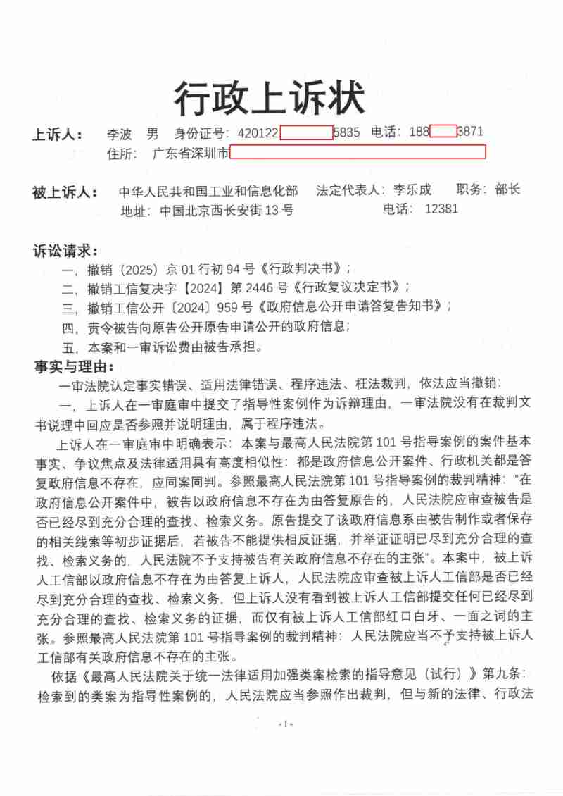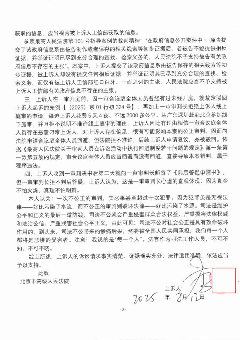 (本案案情简介: 2024年11月3日,我向工信部申请公开《监测识别规则》;11月29日,工信部作出《政府信息公开答复书》,称其没有相关信息;12月16日我向工信部申请行政复议;2025年1月16日,工信部作出《行政复议决定书》,维持;1月18日我向北京第一中级法院邮寄《行政起诉状》;2月8日法院正式立案,7月17日我向法院申请线上开庭,被法官拒绝;7月18日我向法院邮寄《回避申请书》和《投诉信》;7月26日,北京第一中级法院向我邮寄送达驳回回避申请《决定书》;7月29日我从深圳赶赴北京参加线下开庭,并提交针对驳回回避申请的《复议申请书》;7月31日,北京第一法院向我邮寄送达驳回《复议决定书》;8月3日,北京市第一中级法院判决驳回我的诉讼请求;8月4日,我向北京第一中级法院邮寄《判后答疑申请书》;8月12日,我向我向北京第一中级法院邮寄《行政上诉状》,目前等待北京高院作出二审判决;)