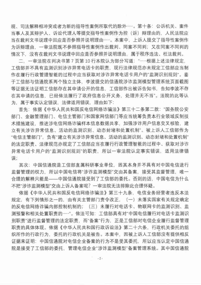 首先:依据《中华人民共和国反电信网络诈骗法》第三十二条第二款:“国务院公安部门、金融管理部门、电信主管部门和国家网信部门等应当统筹负责本行业领域反制技术措施建设,推进涉电信网络诈骗样本信息数据共享,加强涉诈用户信息交叉核验,建立有关涉诈异常信息、活动的监测识别、动态封堵和处置机制”。被上诉人工信部作为“电信主管部门”,负有“建立有关涉诈异常信息、活动的监测识别、动态封堵和处置机制”的法定职责、法律规范亦规定了工信部应当在履行行政管理智能的过程中、获取对涉诈异常电话卡用户的“监测识别规则”的职责,所以一审法院认定事实错误,适用法律错误;