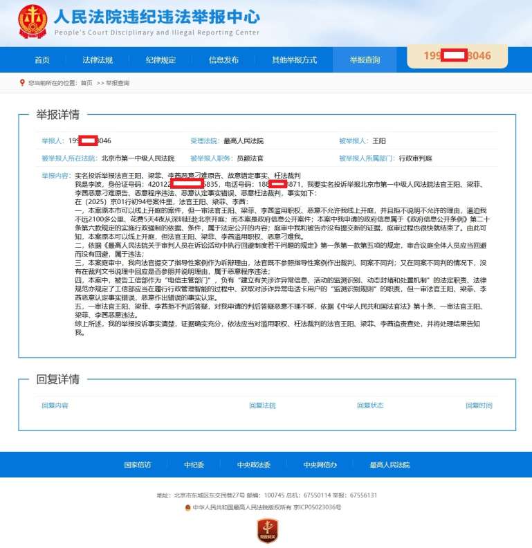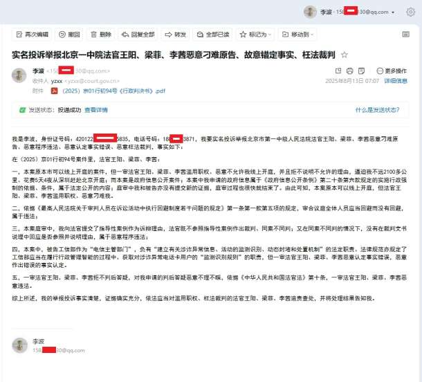 2025年8月13日,我向最高法、纪委监委、检察院,5次实名举报 栏目:工信部4 作者:duifanhuairen 时间:2025-08-13 08:04:26 (本案案情简介: 2024年11月3日,我向工信部申请公开《监测识别规则》;11月29日,工信部作出《政府信息公开答复书》,称其没有相关信息;12月16日我向工信部申请行政复议;2025年1月16日,工信部作出《行政复议决定书》,维持;1月18日我向北京第一中级法院邮寄《行政起诉状》;2月8日法院正式立案,7月17日我向法院申请线上开庭,被法官拒绝;7月18日我向法院邮寄《回避申请书》和《投诉信》;7月26日,北京第一中级法院向我邮寄送达驳回回避申请《决定书》;7月29日我从深圳赶赴北京参加线下开庭,并提交针对驳回回避申请的《复议申请书》;7月31日,北京第一法院向我邮寄送达驳回《复议决定书》;8月3日,北京市第一中级法院判决驳回我的诉讼请求;8月4日,我向北京第一中级法院邮寄《判后答疑申请书》;8月12日,我向我向北京第一中级法院邮寄《行政上诉状》,目前等待北京高院作出二审判决;) 感谢大家的关注和支持,有新的进展我会及时更新。相关文章:2025年8月12日,我向北京第一中级法院邮寄《行政上诉状》2025年8月4日,向北京第一中级法院邮寄《判后答疑申请书》2025年8月3日,北京市第一中级法院判决:驳回我的诉讼请求2025年8月3日,说说7月29日北京第一中级法院的公开庭审2025年7月31日,北京第一法院向我邮寄送达驳回《复议决定书》2025年7月27日,向北京第一中级法院递交的《复议申请书》准备就绪2025年7月26日,北京第一中级法院向我邮寄送达,驳回回避申请《决定书》2025年7月25日,北京第一中级法院网发布开庭公告,7月29日公开开庭2025年7月18日,和《回避申请书》一同邮寄的,还有《投诉信》2025年7月18日,邮寄《回避申请书》,申请回避2025年7月17,我再次申请本月29日线上庭审,被拒2025年7月16日,北京第一中级法院向我邮寄送达开庭《传票》2025年7月15日,北京一中院来电,本月29号上午10点30时分开庭,被告不同意线上开庭2025年7月4日,北京一中院来电,询问《监测识别规则》是什么工信部提交给法院的《行政答辩状》4(关于信息公开)我向法院提交的《行政起诉状》(关于信息公开)工信部给我的《行政复议决定书》(关于信息公开)我向工信部提交的《行政复议申请书》(关于信息公开)工信部给我的《政府信息公开申请答复告知书》(关于信息公开)我向工信部提交的《政府信息公开申请书》(关于信息公开) 怼翻坏人 中国电信 手机停机 热点 反诈 北京 举报 法院