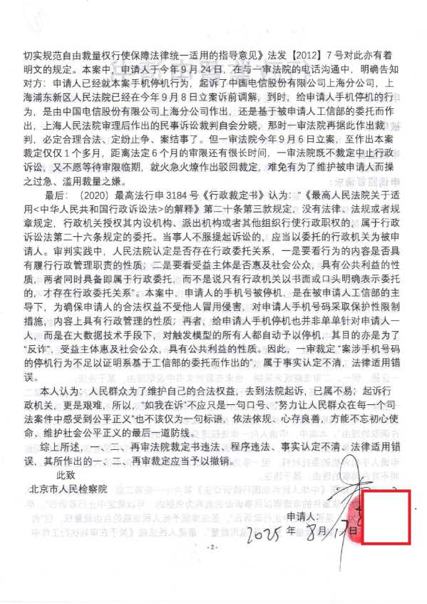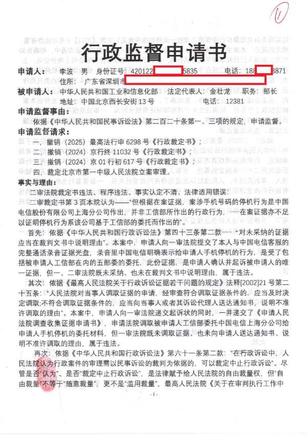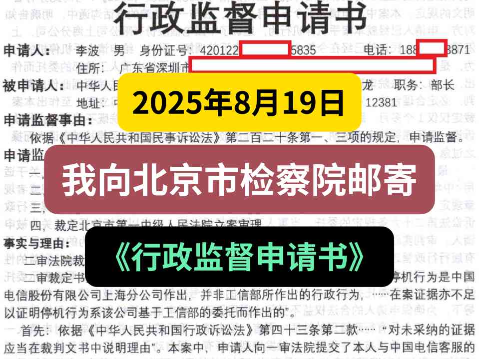 2025年8月19日,我向北京市检察院邮寄《行政监督申请书》 栏目:工信部1 作者:duifanhuairen 时间:2025-08-19 11:17:25 (本案案情简介:2024年7月21日手机被中国电信停机;7月23日我向工信部提交行《政复议申请书》;8月1日工信部作出《不予受理行政复议申请决定书》;8月3日我向北京第一中级法院邮寄《行政起诉状》;8月28日法院要求我补正,我当天补正并邮寄;9月6日法院正式立案;10月21日,法院一审裁定驳回我的起诉;10月23日我向法院邮寄《行政上诉状》;12月1日,北京高级法院正式立案;12月17日,北京市高级法院作出终审《行政裁定书》,驳回我的上诉;2025年5月20日,我向最高人民法院网上申请再审;6月12日,最高法正式立案;7月16日,最高法裁定驳回我的再审申请;8月11日,我向北京市人民检察院提交《抗诉申请书》,目前等待检察院答复;) 昨天收到北京市检察院的短信通知:要求我将监督申请材料邮寄给他们,于是今天我就按照他们的要求邮寄给他们了,接下来就等他们的答复吧。 感谢大家的关注和支持,有新的进展我会及时更新。相关文章:2025年8月18日,刚刚收到北京市检察院短信,太高效了2025年8月18日,我收到北京市检察院的短信通知,随后我打电话过去询问2025年8月11日,我向北京市人民检察院提交《抗诉申请书》2025年7月16日,最高人民法院向我邮寄送达《行政裁定书》2025年6月12日,最高法再审立案(关于手机停机)2025年5月20日,我向最高法申请再审(关于手机停机)北京高级法院作出的二审《行政裁定书》(关于手机停机)我向北京高级法院递交的《行政上诉状》(关于手机停机)北京第一中级法院作出的一审《行政裁定书》(关于手机停机)我向北京第一中级法院邮寄的《行政起诉状》(关于手机停机)工信部给我的《不予受理行政复议申请决定书》(关于手机停机)我向工信部提交的《行政复议申请书》(关于手机停机) 怼翻坏人 中国电信 手机停机 热点 反诈 工信部 法院