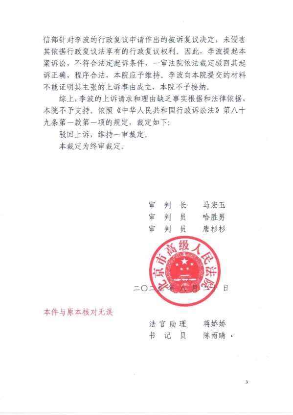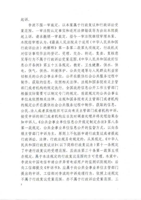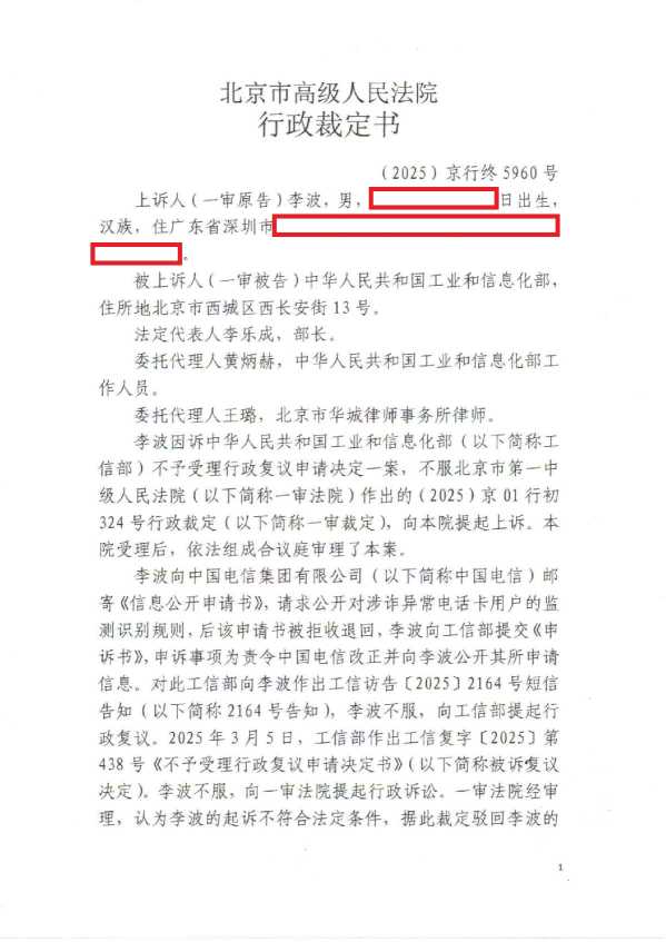 2025年8月21日,北京市高级法院作出二审裁定:驳回我的上诉 栏目:工信部3 作者:duifanhuairen 时间:2025-08-21 14:34:29 (本案案情简介:我向中国电信邮寄《信息公开申请书》,申请公开《监测识别规则》,邮件被中国电信拒收;2025年1月20日,我向工信部邮寄《申诉书》及相关证据材料;2月26日,工信部对我作出信访答复;2月27日,我向工信部申请行政复议;3月10日,工信部作出《不予受理行政复议申请决定书》;3月11日,我向北京第一中级法院邮寄《行政起诉状》;4月7日法院正式立案;5月31日,法院作出一审《行政裁定书》,裁定驳回我的起诉;6月3日,我向法院邮寄《行政上诉状》;7月19日,北京市高级法院已经二审立案;8月21日,北京高级法院作出二审裁定,驳回我的上诉,目前我准备在6个月内,向最高法院申请再审;) 感谢大家的关注和支持,有新的进展我会及时更新。相关文章:2025年7月19日,北京市高级法院已经二审立案,案号是(2025)京行终5960号2025年6月3日,向北京第一中级法院邮寄《行政上诉状》(关于监督电信)今天收到北京第一中级法院邮寄给我的一审《行政裁定书》(关于监督电信)2025年5月14日,收到工信部的《答辩状》(关于监督电信)我向法院提交的《行政起诉状》(关于监督电信)工信部给我的《不予受理行政复议决定书》(关于监督电信)我向工信部提交的《行政复议申请书》(关于监督电信)我向工信部提交的《申诉书》和工信部回复的短信(关于监督电信)我向中国电信邮寄的《信息公开申请书》和被中国电信拒签的邮件 怼翻坏人 中国电信 手机停机 热点 反诈 工信部 法院