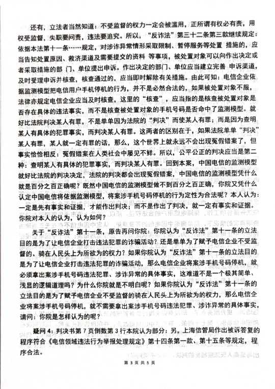 还有,立法者当然知道:不受监督的权力一定会被滥用,正所谓有权必有责,用权受监督,失职要问责,违法要追究。所以,“反诈法”第三十二条第三款继续规定:依据本法第十一条……规定,对涉诈异常情形采取限制、暂停服务等处置 措施的,应当告知处置原因、救济渠道及需要提交的资料 等事项,被处置对象可以向作出决定或者采取措施的部 门、单位提出申诉。作出决定的部门、单位应当建立完善 申诉渠道,及时受理申诉并核查,核查通过的,应当即时解除有关措施。由此可知:电信企业依据监测模型把电信用户手机停机的行为,并不是必然合法的,如果被处置对象不服,法律亦规定电信企业应当及时核查,这里的“核查”,应当指的是核查被处置对象是否存在具体的违法事实,而不是核查被处置对象的手机号码是否命中了监测模型。就好比法院判决某人有罪,不是单单因为法院的“判决”而使某人有罪;而是因为查明某人有具体的犯罪事实,而判决某人有罪。这两者的区别在于,如果法院单单“判决”某人有罪,某人就一定有罪的话,那么,这个世界上就永远不会出现冤假错案了,但事实恰恰相反:冤假错案在人类社会中屡见不鲜。所以,公平公正的判决应当是第二种:查明某人有具体的犯罪事实,而判决某人有罪。回到本案,中国电信的监测模型就好比法院的判决决定,法院的判决都会出现冤假错案,中国电信的监测模型凭什么就是百分之百正确呢?既然中国电信的监测模型做不到百分之百正确,你院又凭什么认定中国电信将依据监测模型,将案涉手机号码停机的行为定性为合法呢?本人认为:一定是先有事实和证据,才能作出判决;而不是作出了判决,就一定有事实和证据。你院对本人的认为,认为如何?