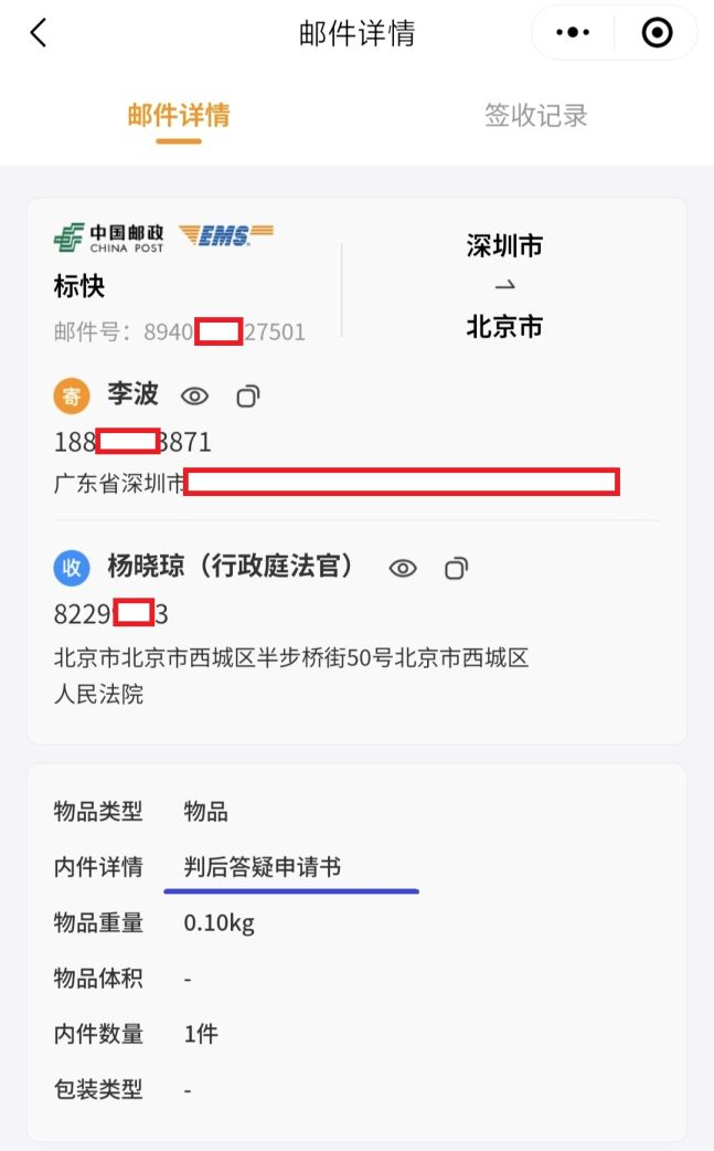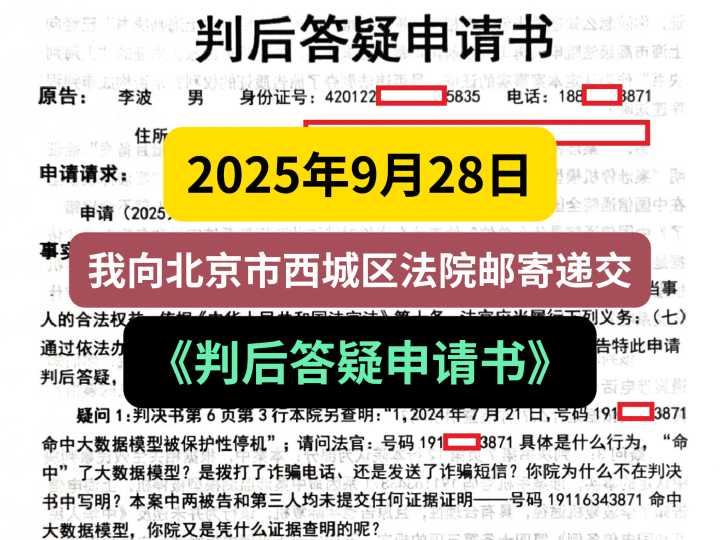 2025年9月28日,我向北京市西城区法院邮寄递交《判后答疑申请书》