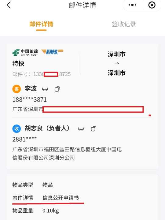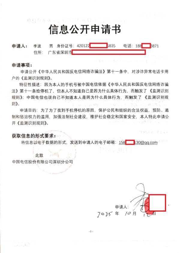 2025年10月12日,我向中国电信深圳分公司邮寄《信息公开申请书》 栏目:深圳电信2 作者:duifanhuairen 时间:2025-10-12 15:56:56 因中国电信深圳分公司坚定的认为:绝对不能公开给手机停机的《监测识别规则》。为了更坚定的捍卫公民的知情权,今天我向中国电信深圳分公司邮寄了《信息公开申请书》,申请公开给手机停机的《监测识别规则》。 感谢大家的关注和支持,有新的进展,我会及时更新, 怼翻坏人 中国电信 手机停机 热点 深圳电信